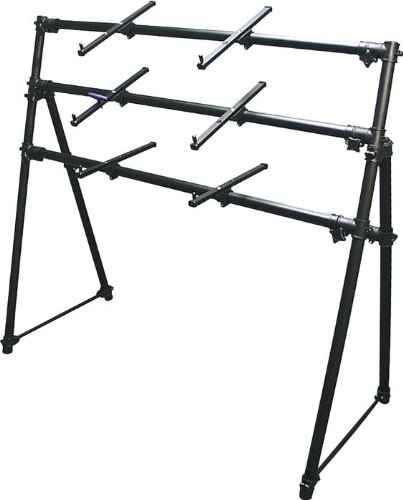 2 of 2 people found the following review helpful Amazon Verified Purchase This review is from: On Stage KS7903 3-Tier A-Frame Keyboard Stand (Electronics) I had one these 10 years ago, I lost it when I move to another house and I've been using Double X stands ever since, but now that I got a Roland PK-5a Bass pedal, I needed an A-Frame again, the pedal doesn't fit under a X frame.I've read the review about "Only the lower tier (3 tier) was adjustable, that's not true, you can tilt or move all 3 tiers up and down, just use the Allen key that comes with it, loose the bracket, move it, tight the bracket again. In the case of the middle tier, even thou it looks like you can't move it down, because of the stand hinges (the stand is shipped with 2 tiers over the hinges and one under), you can easily take the T-Brackets out (using the Allen key again) from the top tier and insert them back at the bottom (you'll need to remove the rubber foot, etc), this way you'll have 2 tiers under the hinges and one tier over, so you can set it for sitting down, do this on one side at the time, putting it flat on the floor, to keep stand's... Read more 1 of 1 people found the following review helpful By Amazon Verified Purchase This review is from: On Stage KS7903 3-Tier A-Frame Keyboard Stand (Electronics) This keyboard "rack" is rock solid product designed more for professional use than for the rest of us. You must stand up in order to use the second and third tier. Only the bottom tier is actually adjustable up or down. The 2nd and 3rd tier are adjustable in a tilt only. Depending on the height (not width) of your keyboards adjustment can be severely limited. This rack does not have an adjustment for width either. Only the the keyboard support rails are adjustable. If I was a pro, I'd consider the more expensive On Stage Rack. As a lazy amateur enthusiast, I might be happier with a lower rack so I may be seated. >>>S.Spurgin 1 of 1 people found the following review helpful By Amazon Verified Purchase This review is from: On Stage KS7903 3-Tier A-Frame Keyboard Stand (Electronics) Great piece of studio furniture. At first, I was skeptical about it, but it has proven to be very sturdy. Right now, I have a M50, Fantom X6, and a Micro Korg and Micro Sampler on it. From time to time when I'm not looking, my 2 year old hangs from it. Great stand at a great price. |